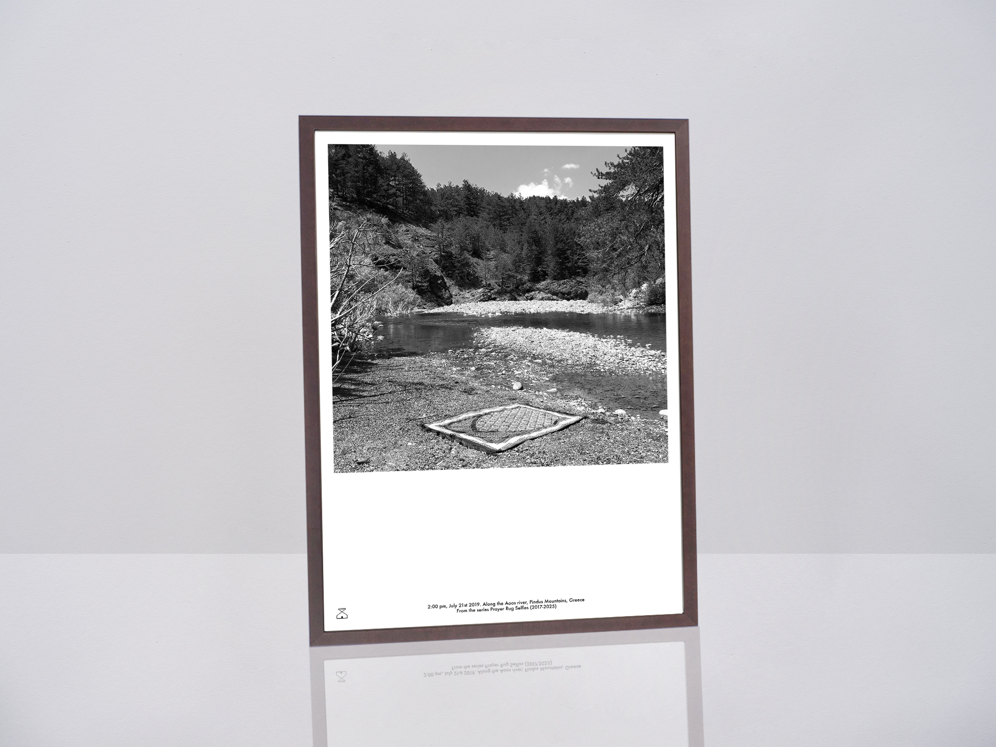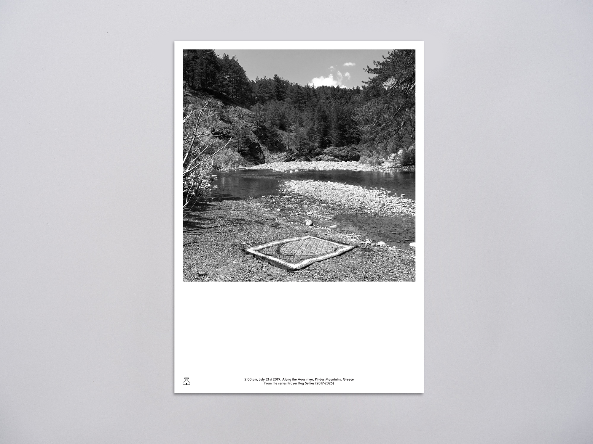 This poster features ‘2:00 pm, July 21st, 2019. Along the Aoos River, Pindus Mountains, Greece,’ a work from Prayer Rug Selfies, Marwan Bassiouni’s long-term series and forthcoming monograph.